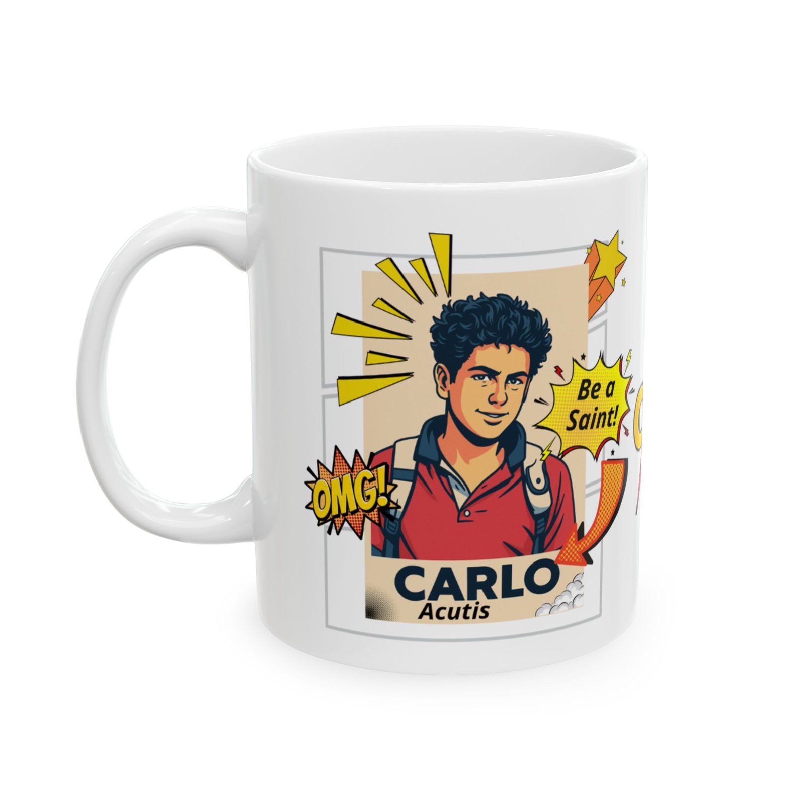 “Mug featuring Saint Carlo Acutis. Perfect to inspire faith and devotion in your daily life, whether at breakfast or at work. A special gift for anyone seeking to live holiness in everyday life.”